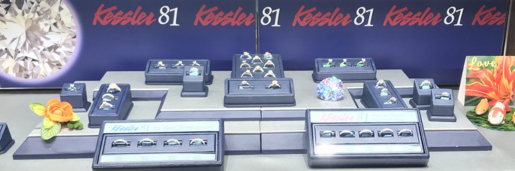 Our team of graphic artists provides a variety of services for Kesslers Diamonds, including: designing large format photos for windows and interiors (vinyl, illuminated, magnetic, banners), creating designs for vinyl case backs, putting testimonials on branded tent-cards, developing promotional displays, and creating vinyl wall messaging.