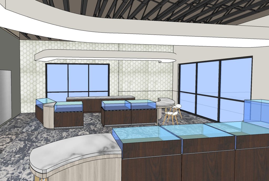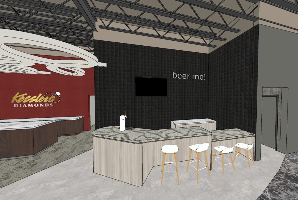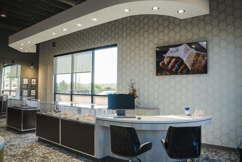 For over 15 years we have been providing Kesslers Diamonds with layout, interior design and décor, signage, and displays for all eight of their locations. The design directive is to provide an on-trend, warm and inviting interior that showcases Kesslers Diamonds and appeals to their target market. The stores encourage customer exploration and discovery. Their logo and branding colors have been incorporated into the spaces, along with designs that infuse circles, facets and sparkle. Retailworks directs the layout and placement of the jewelry cases, as well as the design of custom display cases. Each location includes consultation booths, a beverage lounge, and fabulous restrooms! Lighting is a critical element to highlight the radiance of the diamonds so we have coordinated with lighting manufacturers to provide lamps with the best possible color and intensity. After the stores are up and running, Retailworks provides seasonal display changes to keep the Kesslers Diamonds stores looking fresh and appealing all year long.