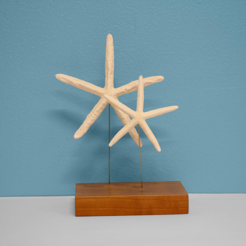 Treasures from the Sea of Love. Add a coastal touch to your cases with this elegantly simple double starfish display prop. Pair of starfish on stand is approximately 12″h.